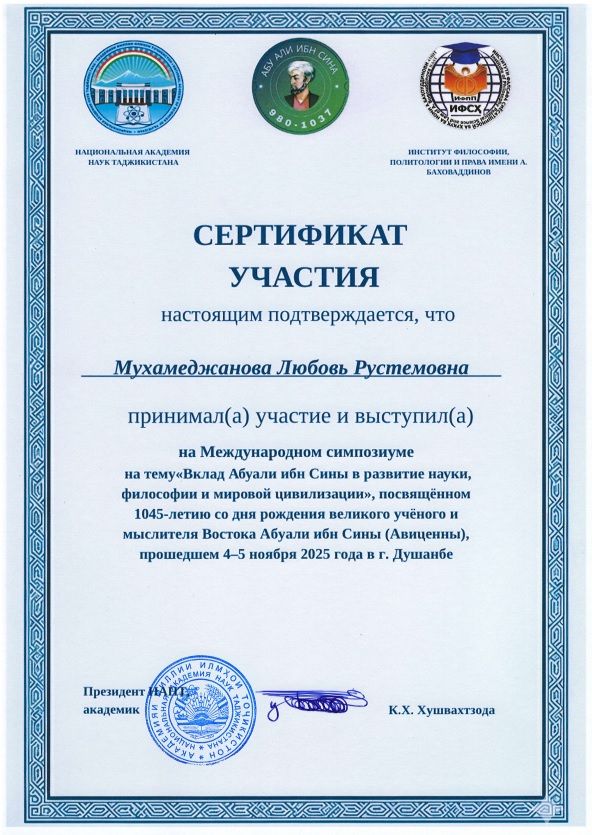 4-5 ноября 2025 года в городе Душанбе Центром авиценноведения совместно с отделом истории философии Института философии, политологии и права Национальной академии наук Таджикистана проведен Международный симпозиум «Вклад Абуали ибн Сины в развитие науки, философии и мировой цивилизации», посвященный 1045-летию со дня рождения великого ученого и мыслителя Востока Абуали ибн Сины (Авиценны). Абуали ибни Сино по праву считается величайшим таджикским учёным, философом и врачом. Им написано более 450 научных трудов, из которых до наших дней дошли около 240. Из них 150 посвящены философии, а более 40 — медицине.