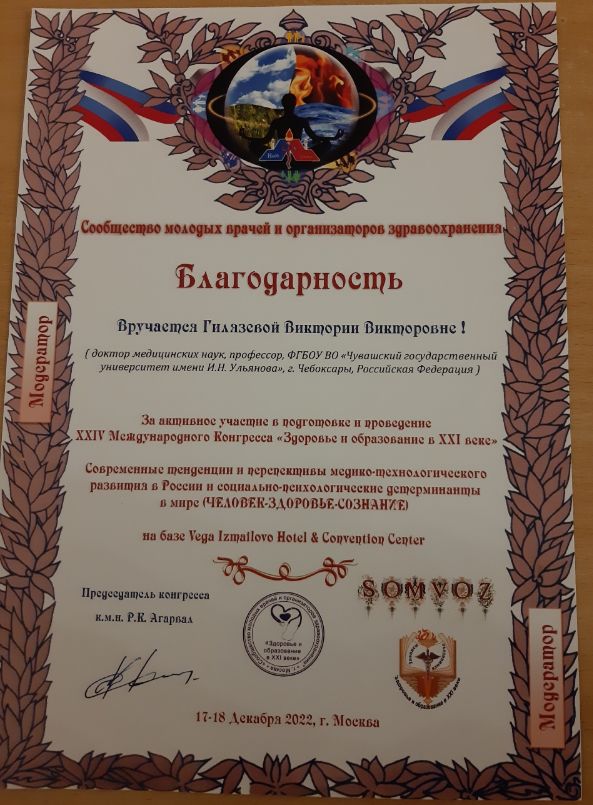 17 декабря 2022 года профессор Гилязева В.В. представила Чувашский государственный университет имени И.Н. Ульянова на XXIV Международном конгрессе "Здоровье и образование в XXI веке" в г. Москве.