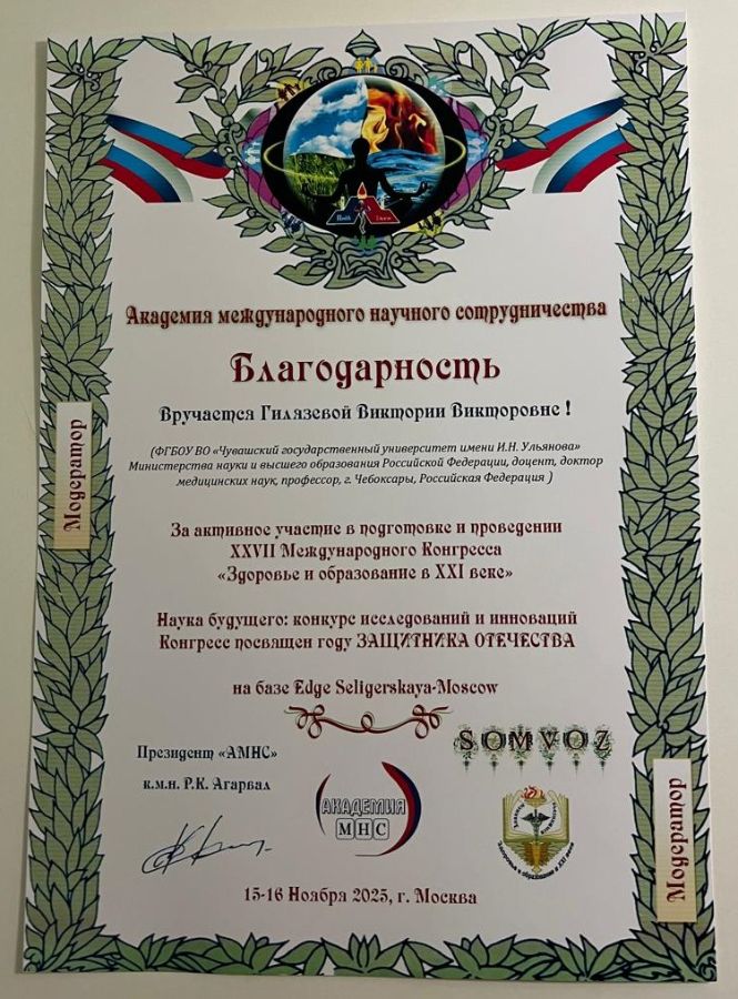 За активное участие в подготовке и проведении XXVII Международного конгресса "Здоровье и образование в XXI веке" Академия международного научного сотрудничества вручила профессору Гилязевой В.В. благодарность.
