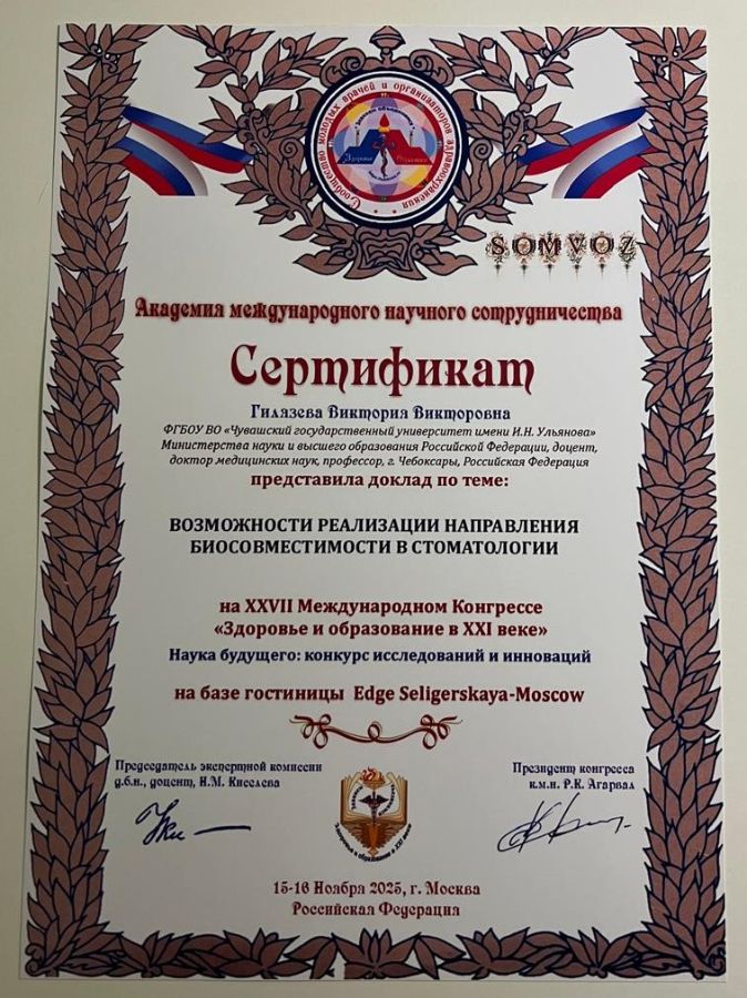 14-17 ноября 2025 года в г. Москве состоялся XXVII Международный конгресс "Здоровье и образование в XXI веке". Наука будущего: конкурс исследований и инноваций. Конгресс посвящен году Защитника Отечества. Это научно-организационное мероприятие, целью которого является обучение в рамках реализации модели отработки основных принципов непрерывного медицинского образования, обмен информацией и координация научных исследований в области медицины, биологии, современной педагогики. Конгресс стал высококачественной платформой для обмена научными достижениями, интеграции исследований и установления международного научного сотрудничества.